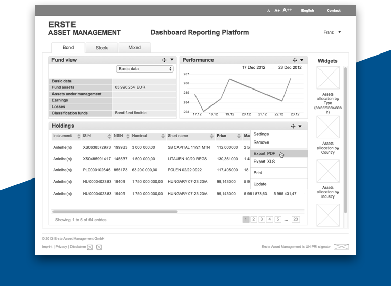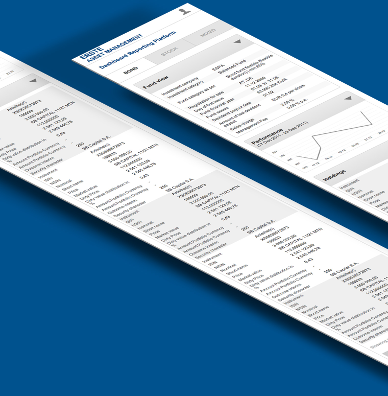 Informative reporting dashboard is an essential part of the efficient management of the various investment funds. The dashboard features include various tables, charts and pies/bars which can be easily dragged and dropped and provide with a real-time view of the sample data.